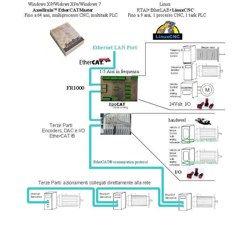 Il bus di campo EtherCAT® , permette di integrare in una sola soluzione motori/ azionamenti controllati in frequenza dal modulo EpoCAT FR1000 insieme a motori/ azionamenti, inverter controllati in velocità o coppia con riferimento analogico e con motori/ azionamenti collegati direttamente alla stessa rete, a cui si possono aggiungere I/O ed altri dispositivi EtherCAT®. Il tutto viene gestito da un SW EtherCATMaster come: AxesBrain™ o LinuxCNC